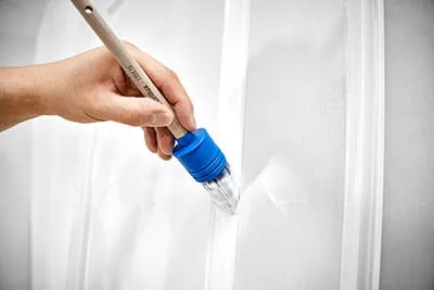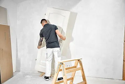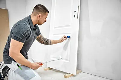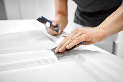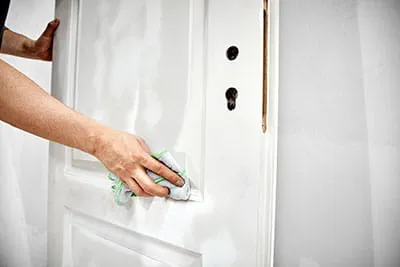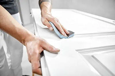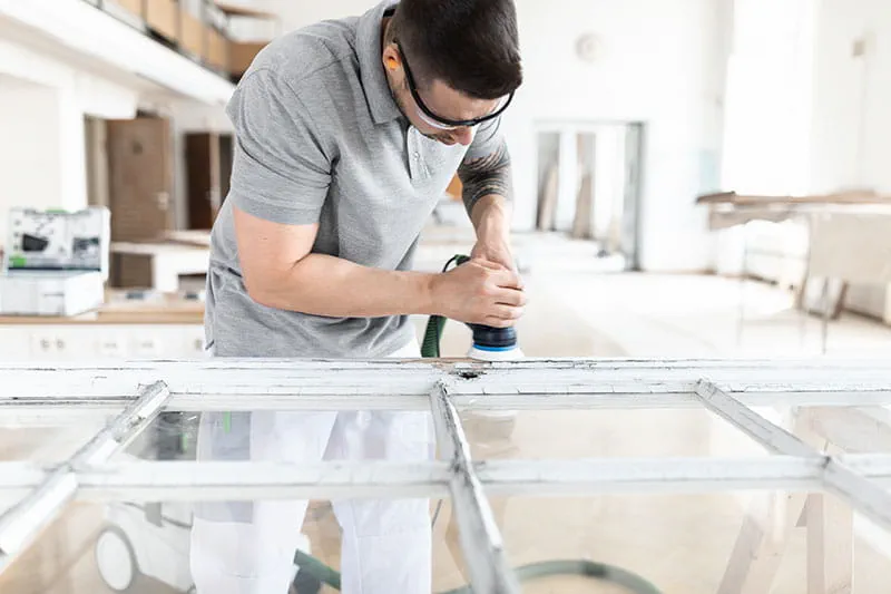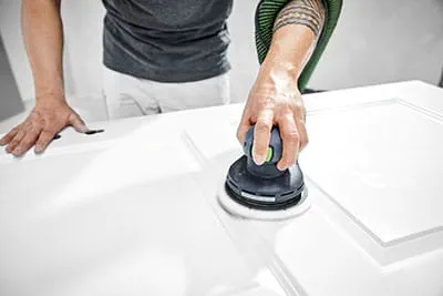 Deshalb wird im ersten Schritt die Oberfläche der Türe mit dem Exzenterschleifer ETS EC 125 oder 150 angeschliffen. Bei wasserbasierten Lacken empfehlen wir ein Schleifmittel mit der Körnung ab P150/ P180, bei Alkydharzlack ab P150.
