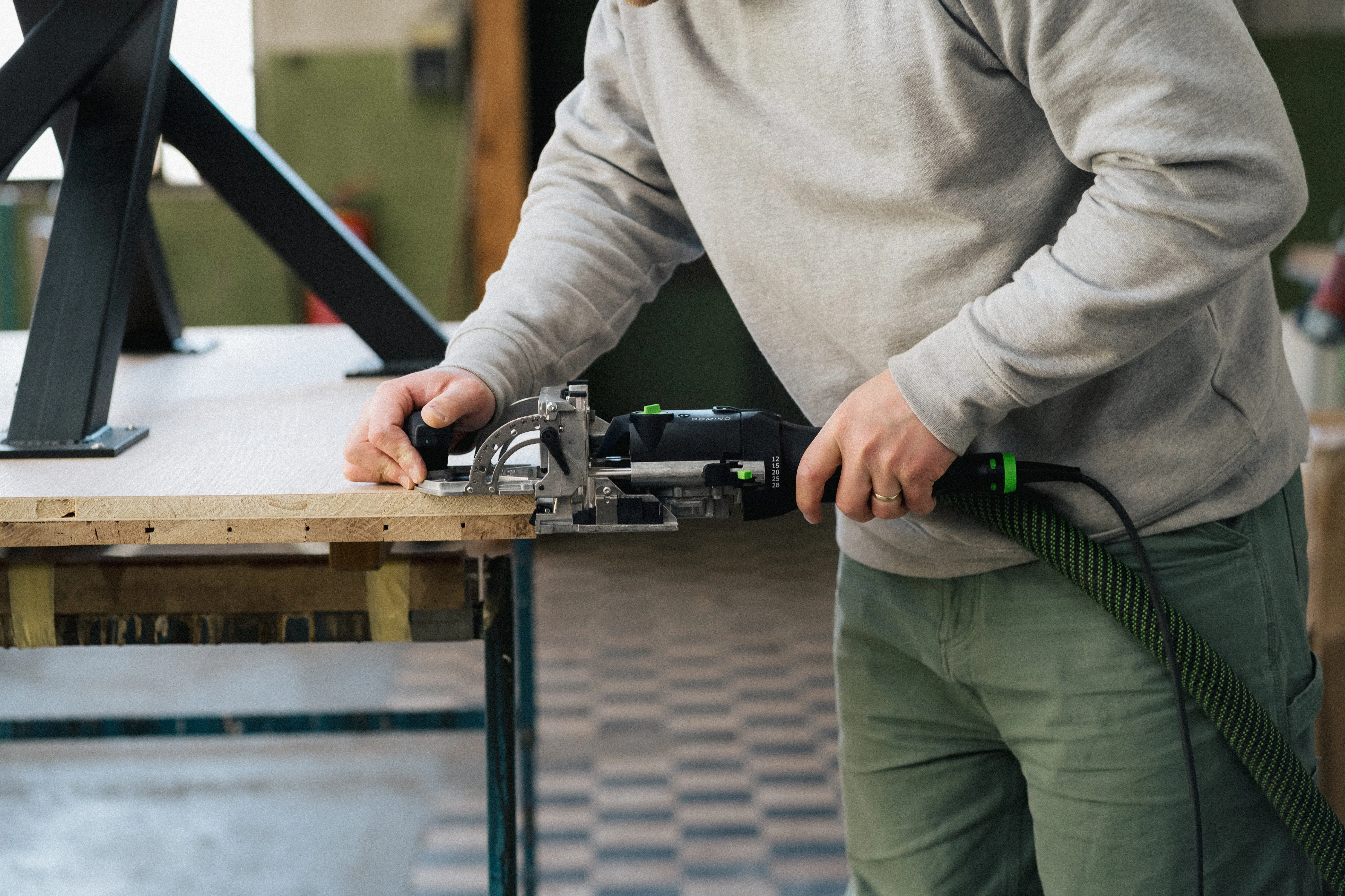 Bei mir findet man tatsächlich auch nur Werkzeug von Festool, von Exzenterschleifer über Tauchsäge und Akkuschrauber bis hin zu den Oberfräsen. Ich finde es einfach schön, dass das alles ein System ist und die Tools auch sinnvoll und wertig sind, deswegen wurde das Geld am Anfang immer direkt in neue Maschinen investiert und ich bereue es nicht, denn es macht einfach Sinn. Wir arbeiten jetzt zu dritt hier, wir haben vernünftiges Werkzeug und es geht nichts kaputt, das wird auch wertgeschätzt. Mir war es von Anfang an sehr wichtig, dass wir mit qualitativ hochwertigem Werkzeug arbeiten können und da ist Festool einfach unschlagbar.