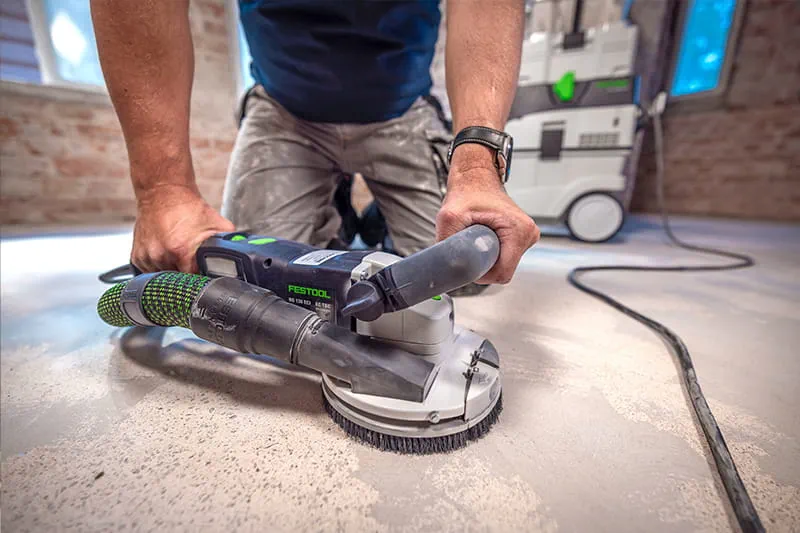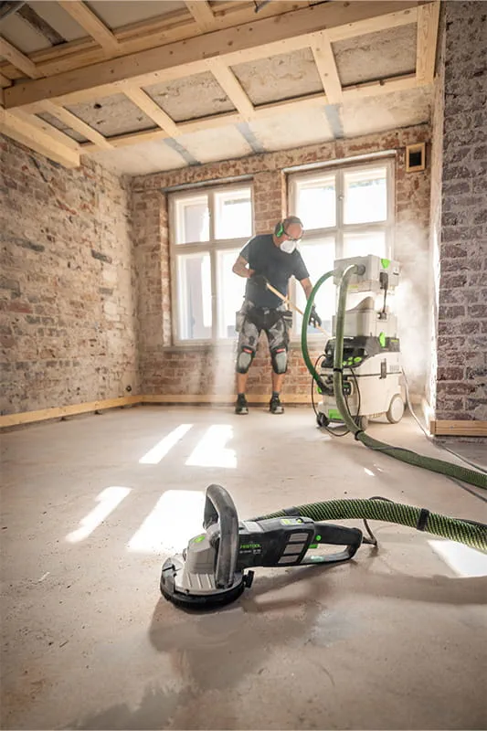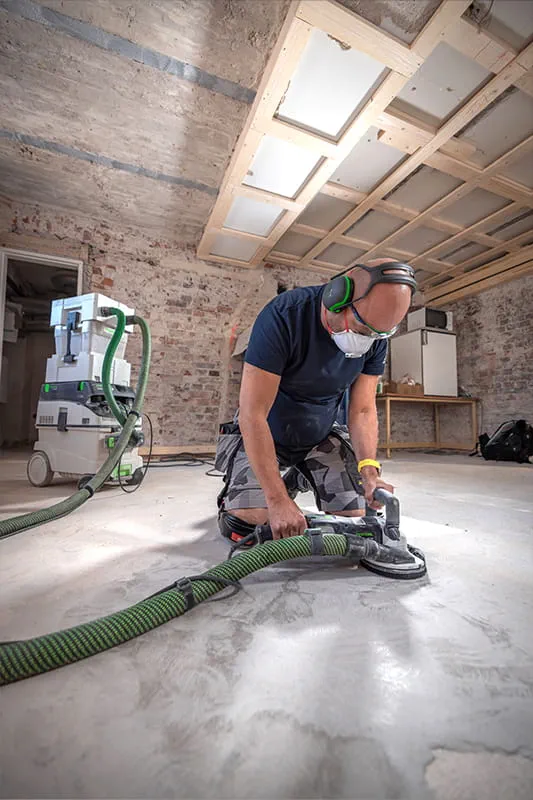 Der RG 130 ECI gleitet über den Untergrund, während das Absaugsystem, bestehend aus Sauger und Vorabscheider, seinen Dienst tut. „Mir gefällt, wie gut der Vorabscheider funktioniert – so verstopft der Filter nicht. Der Sauger ist nicht nur effizient, sondern durch die Fernbedienung am Saugschlauch auch komfortabel zu bedienen“, findet Seppo. Wo auf der großen Baustelle Steckdosen knapp sind, ermöglicht die SYS-PowerStation zusätzliche Flexibilität. Auch darüber hinaus setzt er für seine vielfältigen Aufträge gern Akkuwerkzeuge wie Schleifmaschinen, Kreissägen und Rührgeräte ein. „Eins ist sicher – ich gehe keinen Tag ohne meinen Akkuschrauber zur Arbeit!“ stellt er lachend fest.