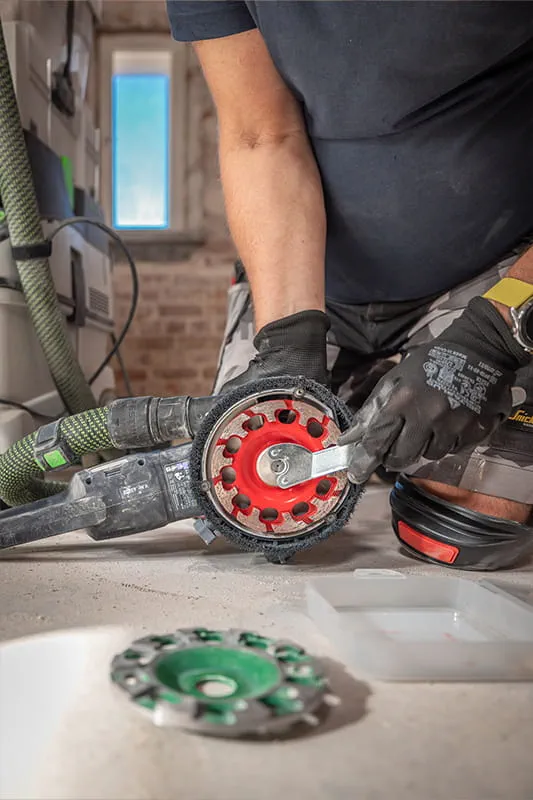 Im ersten Schritt bereitet der Handwerker die Böden für die weitere Bearbeitung vor, gleicht hierzu Unebenheiten im Estrich aus und entfernt Klebereste mit dem Sanierungsschleifer. Da es sich hierbei um besonders große Flächen handelt, freut sich Seppo, den neuen RG 130 ECI direkt am Projekt testen zu können. Doch wie fühlt er sich denn nun an, der neue Powerschleifer? „Ich habe schon beim ersten Handgriff gespürt, dass es sich um eine hochwertige und effiziente Maschine handelt. Besonders gut hat mir gefallen, wie leistungsstark die Maschine ist, aber gleichzeitig die Drehzahl flexibel angepasst werden kann“, freut sich der erfahrene Handwerker über die konstante Kraft des Sanierungsschleifers auch in niedrigen Drehzahlbereichen. Besonders auffällig für ihn: der bürstenlose EC-TEC Motor, der vor Überhitzung schützt. „Der Motor ist sehr kraftvoll und ich hatte keine Probleme mit Überhitzung. Da das für mich eine Arbeitsunterbrechung bedeuten wurde, bin ich sehr glücklich darüber, dass die Maschine nicht abkühlen muss.“ Mit wenigen Handgriffen wechselt Seppo die Diamantscheibe des Schleifers, um verschiedenen Materialien optimal bearbeiten zu können.