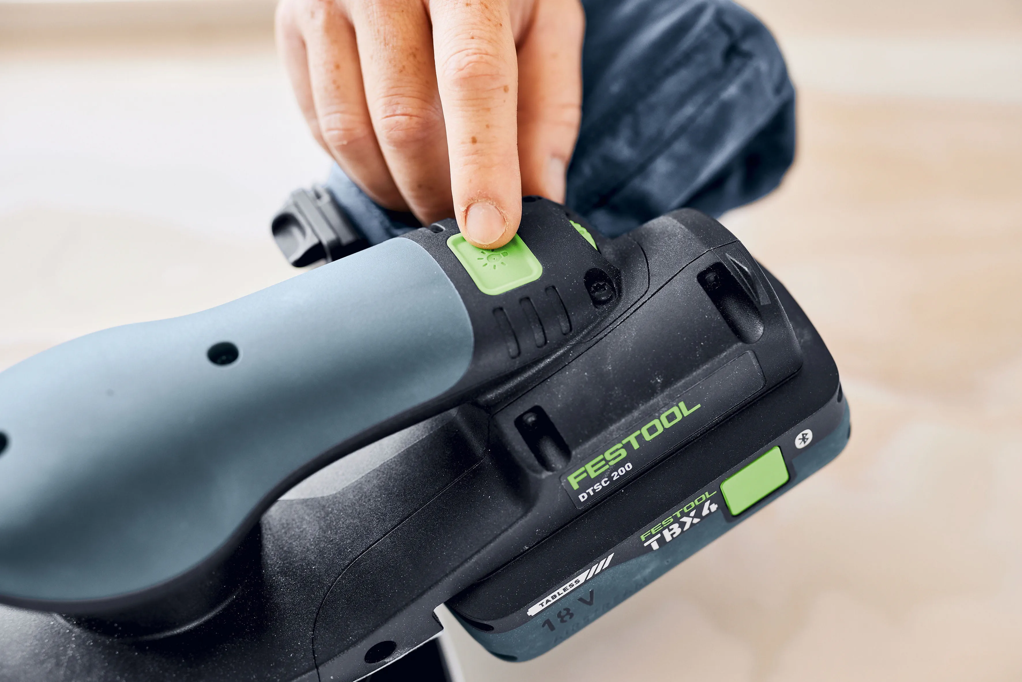 Lichtmodi – volle Beleuchtung oder gedimmtes Licht – lassen sich direkt am Gerät einstellen. Über die Festool App lässt sich das Licht zusätzlich stufenlos dimmen und die Nachleuchtdauer anpassen, um die Oberfläche nach dem Schleifen nochmals zu prüfen. So wird die Qualität des Schleifergebnisses deutlich verbessert –selbst bei schlechten Lichtverhältnissen.