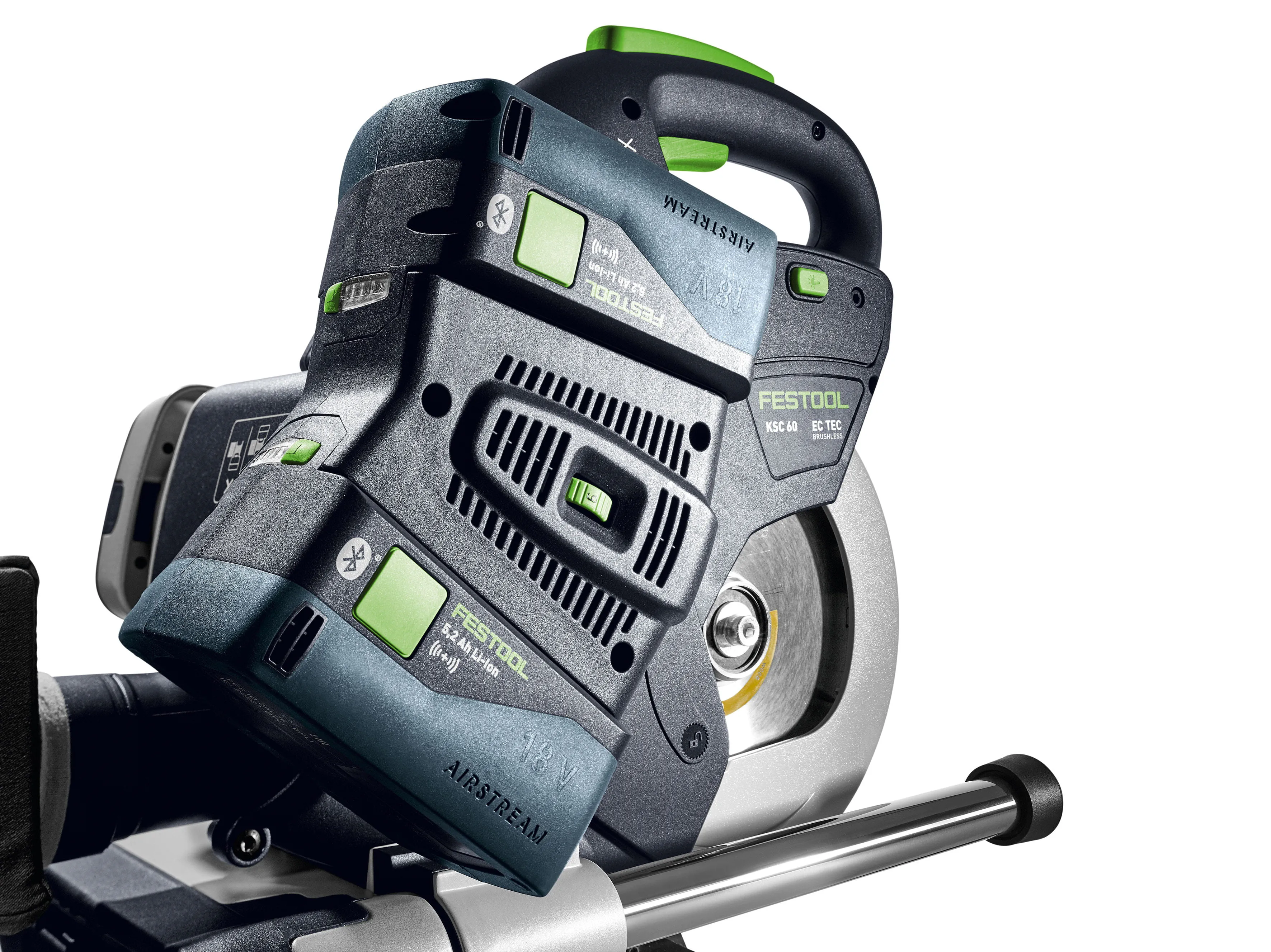 Hochpräzise Kappschnitte: Die neue Akku-Kapp-Zugsäge KSC 60 Die mit Akkupower betriebene KAPEX KSC 60 ist bärenstark und dank beidseitigem Gehrungswinkel von bis zu 60 Grad und ebenfalls beidseitigem Neigungswinkel von bis zu 46 (rechte Seite) respektive 47 Grad (linke Seite) extrem flexibel in der Anwendung. Für mehr Durchzugskraft und Reichweite sorgt das clevere Doppelakku-System: So lässt sich die KSC 60 mit einem oder zwei 18-Volt-Akkupacks von Festool betreiben und bietet Power für den gesamten Arbeitstag. Dank der zweifach gelagerten Doppelsäulenführung wird eine präzise, reibungslose Sägeblattführung ermöglicht. So gelingt jeder Sägeschnitt perfekt, ganz ohne Wackeln oder Ruckeln. Das LED-Schlaglicht überträgt den Schlagschatten des Sägeblatts als exakte Schnittlinienanzeige auf das Material und bietet gleichzeitig eine optimale Sicht auf den Anriss. Für den portablen Einsatz und kleinere Sägearbeiten kommt die KSC 60 ab Werk mit einem Staubfangbeutel. Ebenfalls im Lieferumfang enthalten ist eine praktische Winkelschmiege. Sie macht die schnelle Abnahme von Innen- und Außenwinkeln und den anschließenden Übertrag auf die Säge einfach und exakt. Cleveres Detail: Dank der zusätzlichen Füße kann der Arbeitstisch der KSC 60 mit wenigen Handgriffen exakt auf die Höhe eines Systainers SYS 3 M 112 oder eines SYSTAINER SYS 1 erhöht werden. Dieser kann so als Arbeitstisch genutzt werden und lange Werkstücke werden sicher abgestützt. So ist Präzision kein Zufallsprodukt, sondern gelingt mit Sicherheit – Schnitt für Schnitt.