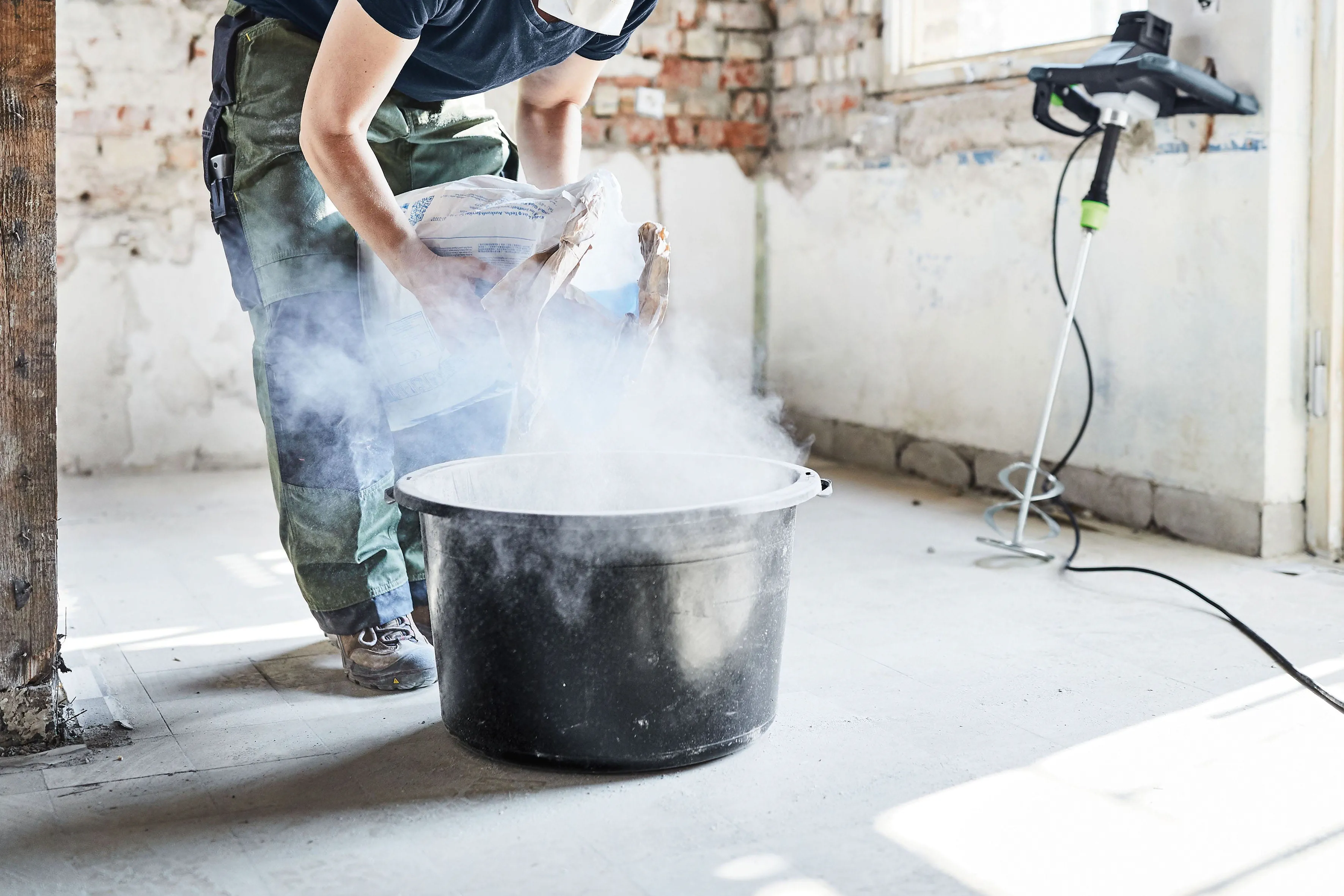 Festool hat in den Lieferumfang von jedem Rührwerk eine MX-Absaugung gepackt. Damit lässt sich jegliches Material rühren und mischen - ganz ohne Staub. Die MX-Absaugung wird einfach am Rand des Mischeimers geklemmt. Mit dem Einschalten des Saugers verschwindet der Staub bereits beim Einschütten des Mischmaterials in den Sauger. So kämpft man auch beim Rühren nicht mehr mit dichten Staubwolken. Das schont die Lungen des Anwenders und hinterlässt eine saubere Baustelle – ohne zusätzliche Reinigungsarbeiten.