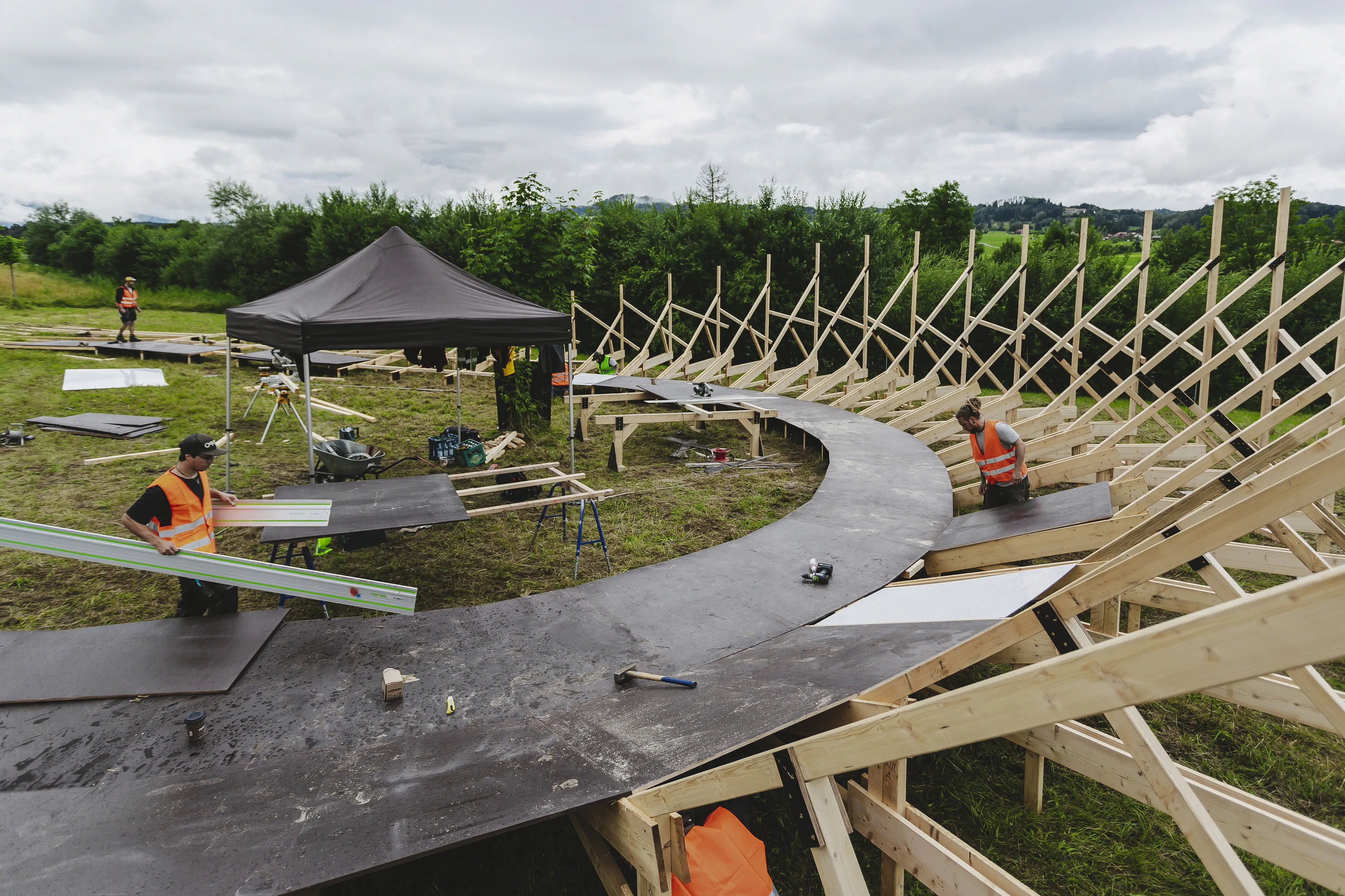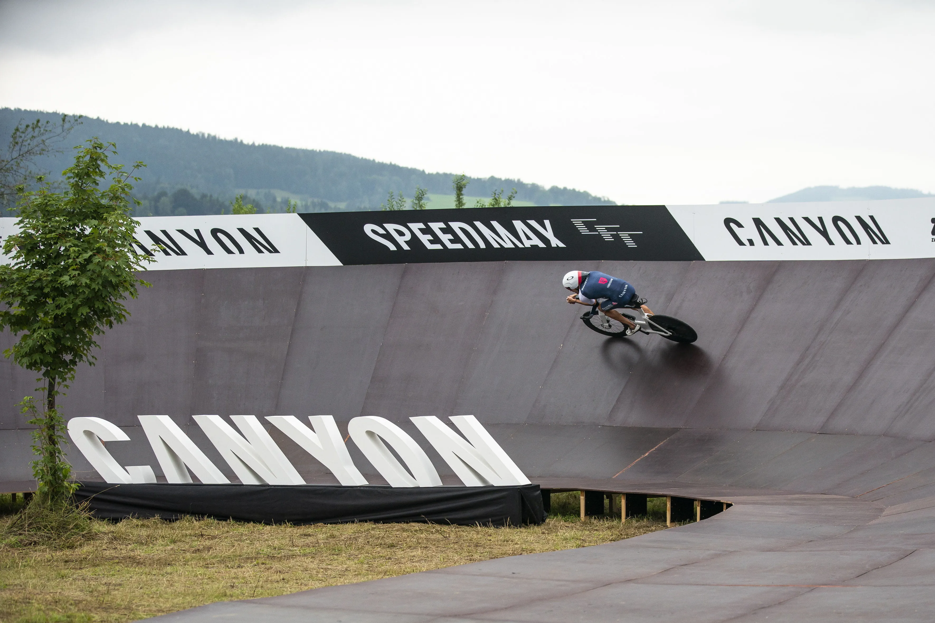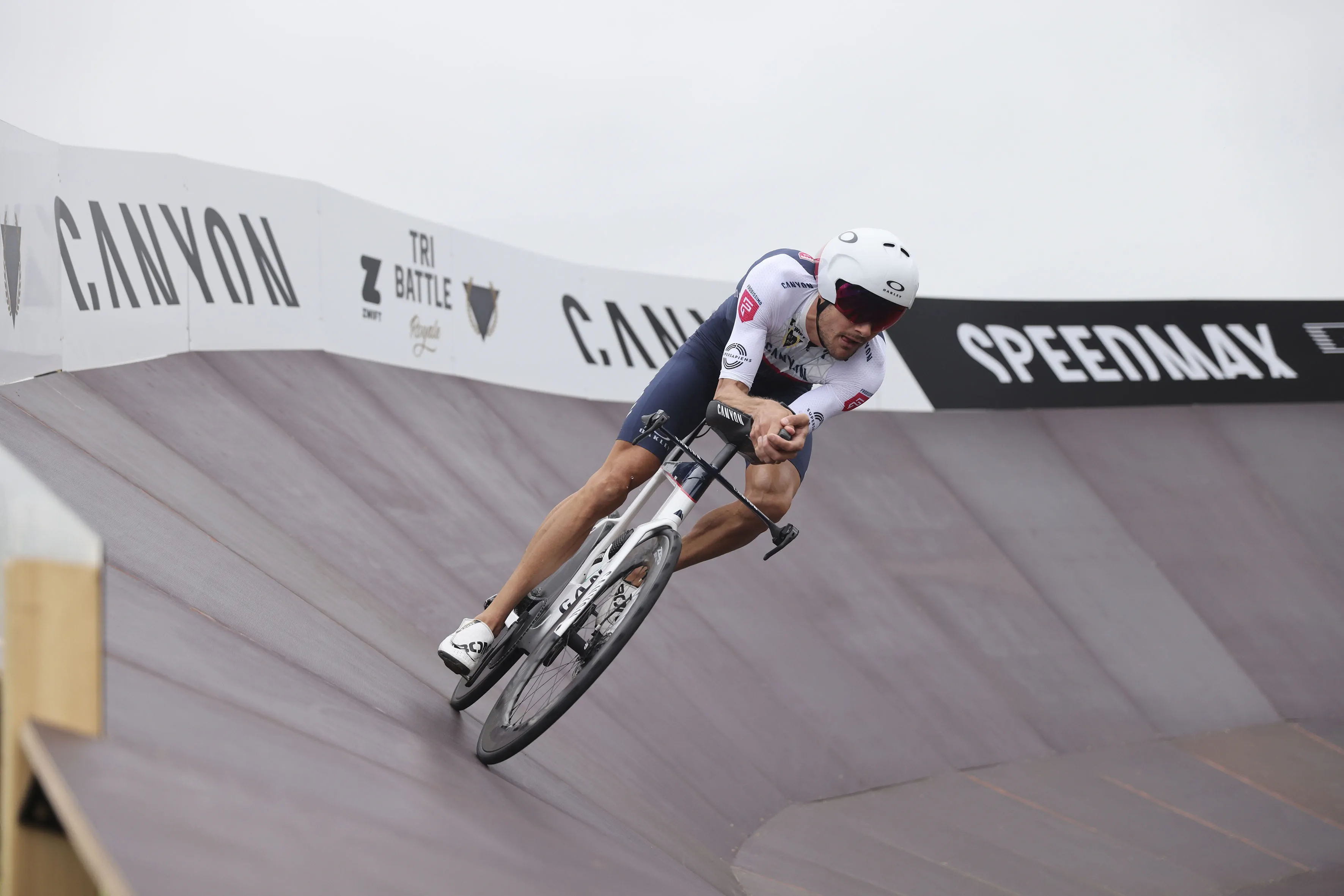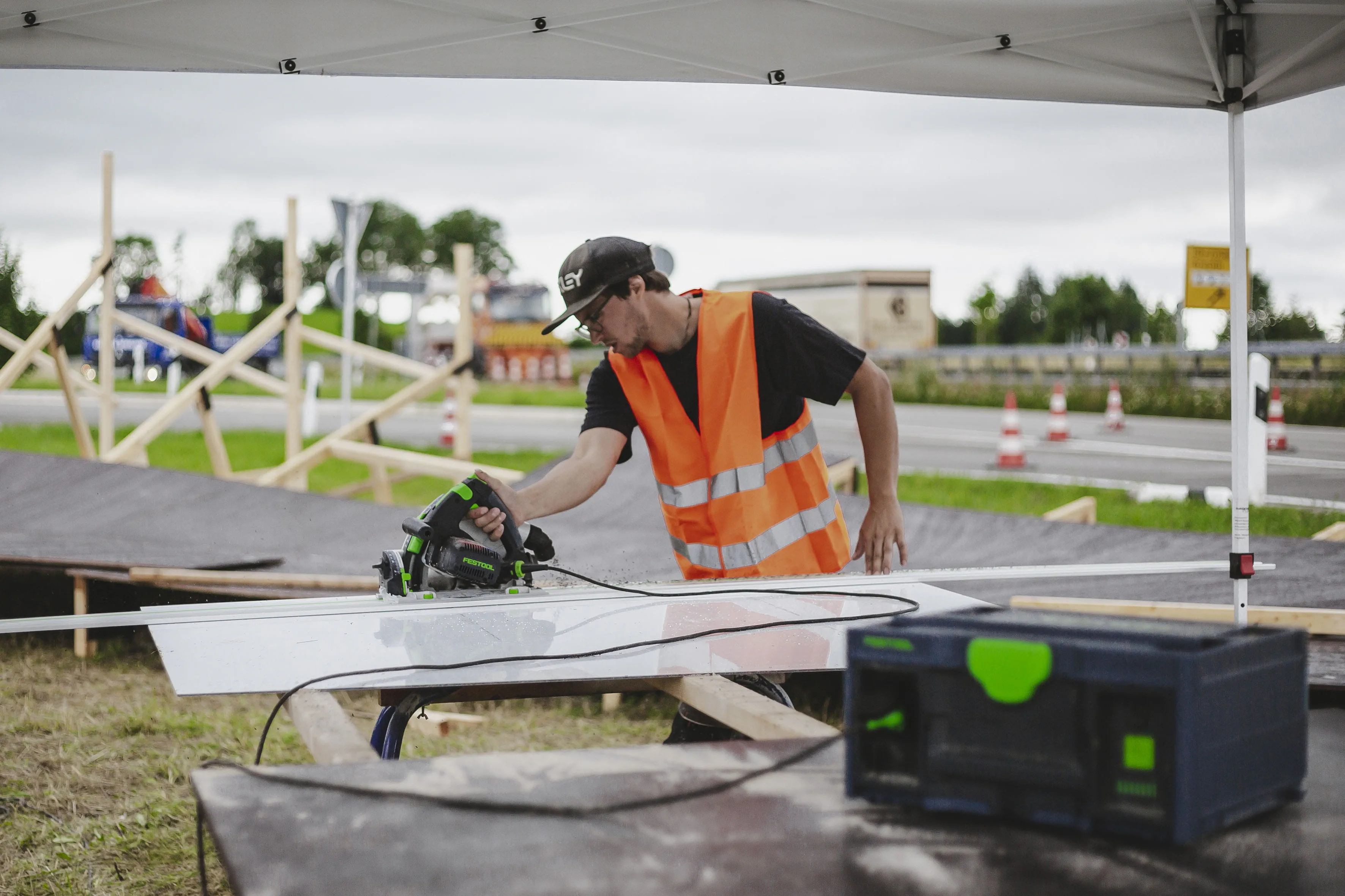 Für die neue Bestzeit mussten nicht nur die beiden Triathleten topfit sein, sondern ebenso eine geeignete Strecke gefunden werden. Dazu bot sich die mitten durch das Allgäu führende Bundesstraße 19 an – und mit mehreren Runden könnten hier die notwendigen Kilometer zusammenkommen. Gesagt, getan und zudem sollte ein geeigneter Wendepunkt dafür sorgen, dass der Weltrekordversuch nicht unnötig abgebremst wird. Die beste Lösung für das Rennen um Sekunden? Eine Rampe. Ganz aus Holz und ähnlich einer Steilwand im Bahnradsport, mit der eine schnelle Wende gelingen könnte. Prädestiniert für solche Konstruktionen ist Schneestern: Ein Anruf der Tri-Battle-Macher beim Actionsport-Spezialisten Schneestern in Durach im Allgäu sorgte für Klarheit und bei deren Chef Dirk Scheumann für leuchtende Augen. Er war sofort Feuer und Flamme für die Idee und wusste: Mit ein bisschen Holz und ein paar Schrauben ist es da nicht getan. Die Steilwand musste wegen des zu erwartenden Tempos und der damit verbundenen Belastung richtig stabil werden. Den ersten Überlegungen, Skizzen und einem Prototyp folgte die Umsetzung: 19.000 Schrauben, 10,5 Kubikmeter Holz und 96 Siebdruckplatten – so viel Material war notwendig, um Frodeno und Sanders bei ihrer neuen Radfahrbestzeit zu unterstützen. Mit 75 Meter Länge, 4,5 Meter Höhe und 300 Stunden Bauzeit war der Wendepunkt, der „Canyon Turn“, alles andere als ein Leichtgewicht und kein alltägliches Stück Handwerk. Malte Ahrens, Projektmanager bei Schneestern: „Es war massiv, es war riesig.“ Vor allem der Aufbau der Steilwandkurve an der Auffahrt zur extra gesperrten Bundesstraße sei eine Herausforderung gewesen und habe drei Tage gedauert. Während der Abbau deutlich schneller ging und am gleichen Tag nach der Tri-Battle beendet war, wurden die Bauteile für den Tag der Herausforderung vorgefertigt an ihren Bestimmungsort transportiert und dort im Baukastensystem zusammengesetzt. Was entscheidend war: Alles musste exakt sitzen. Nichts durfte wackeln, nichts durfte sich verschieben.