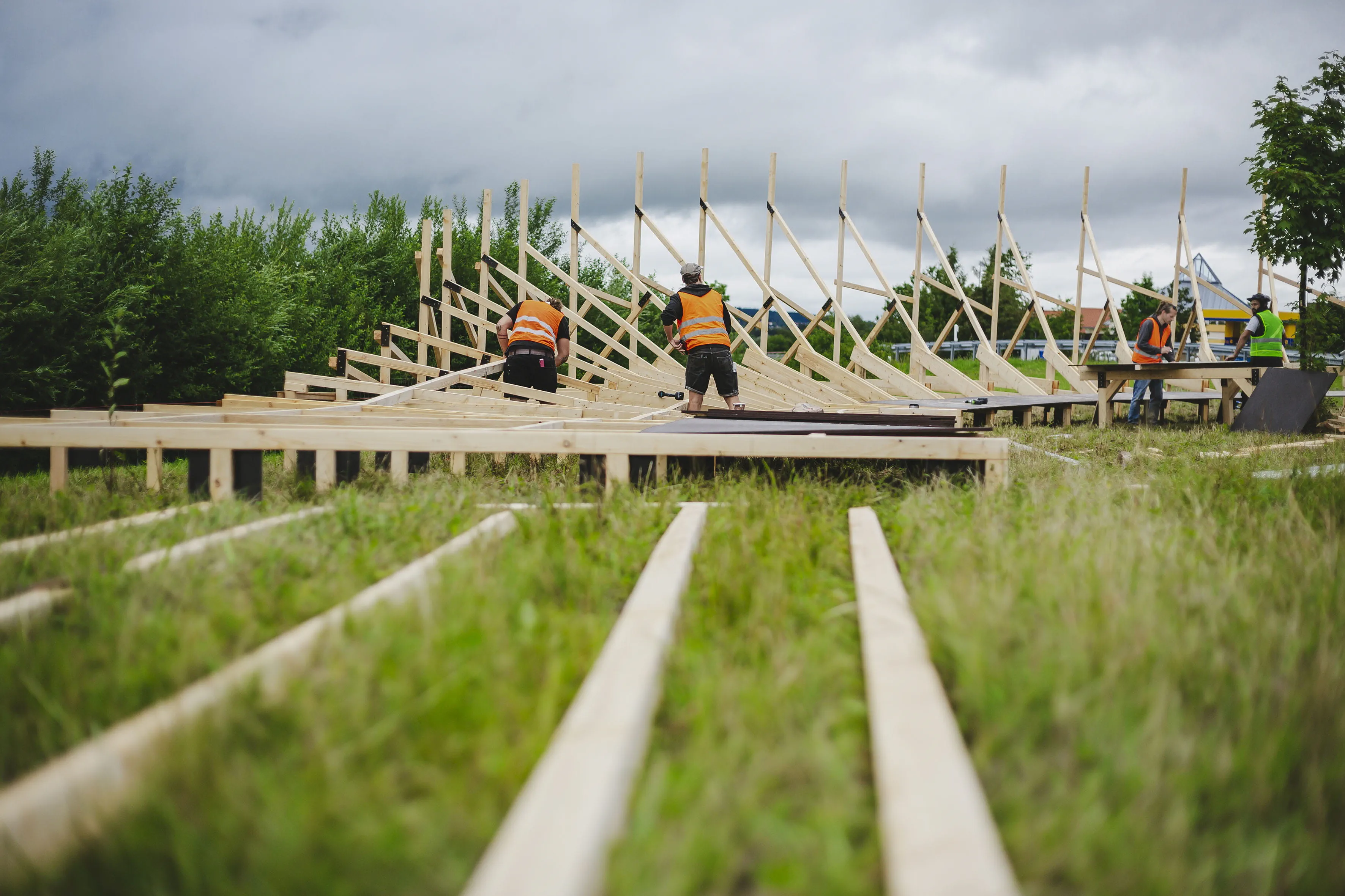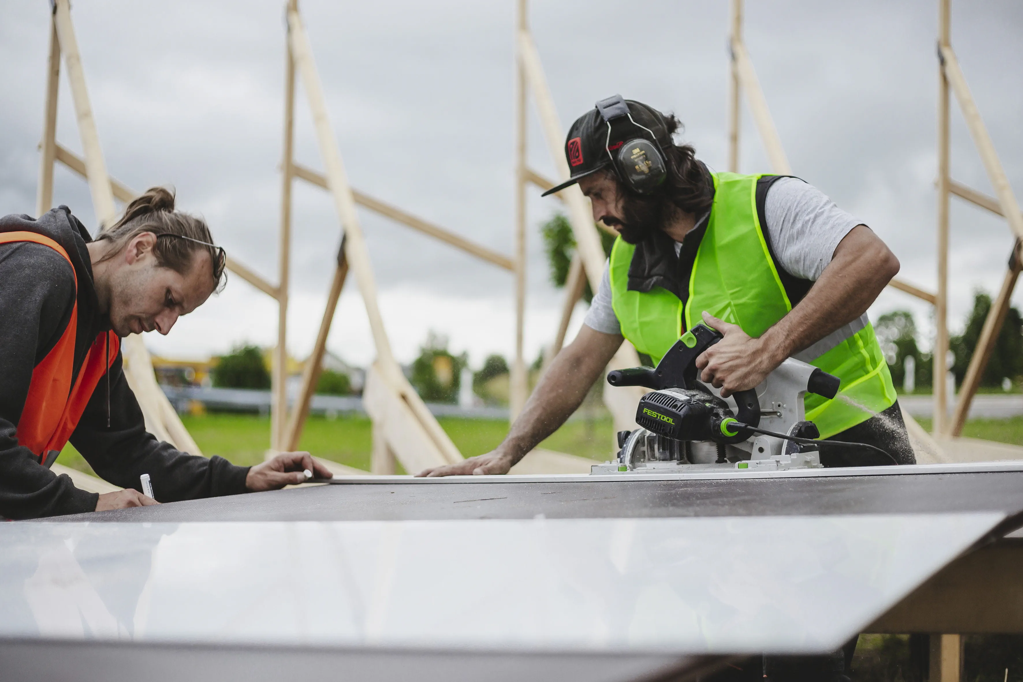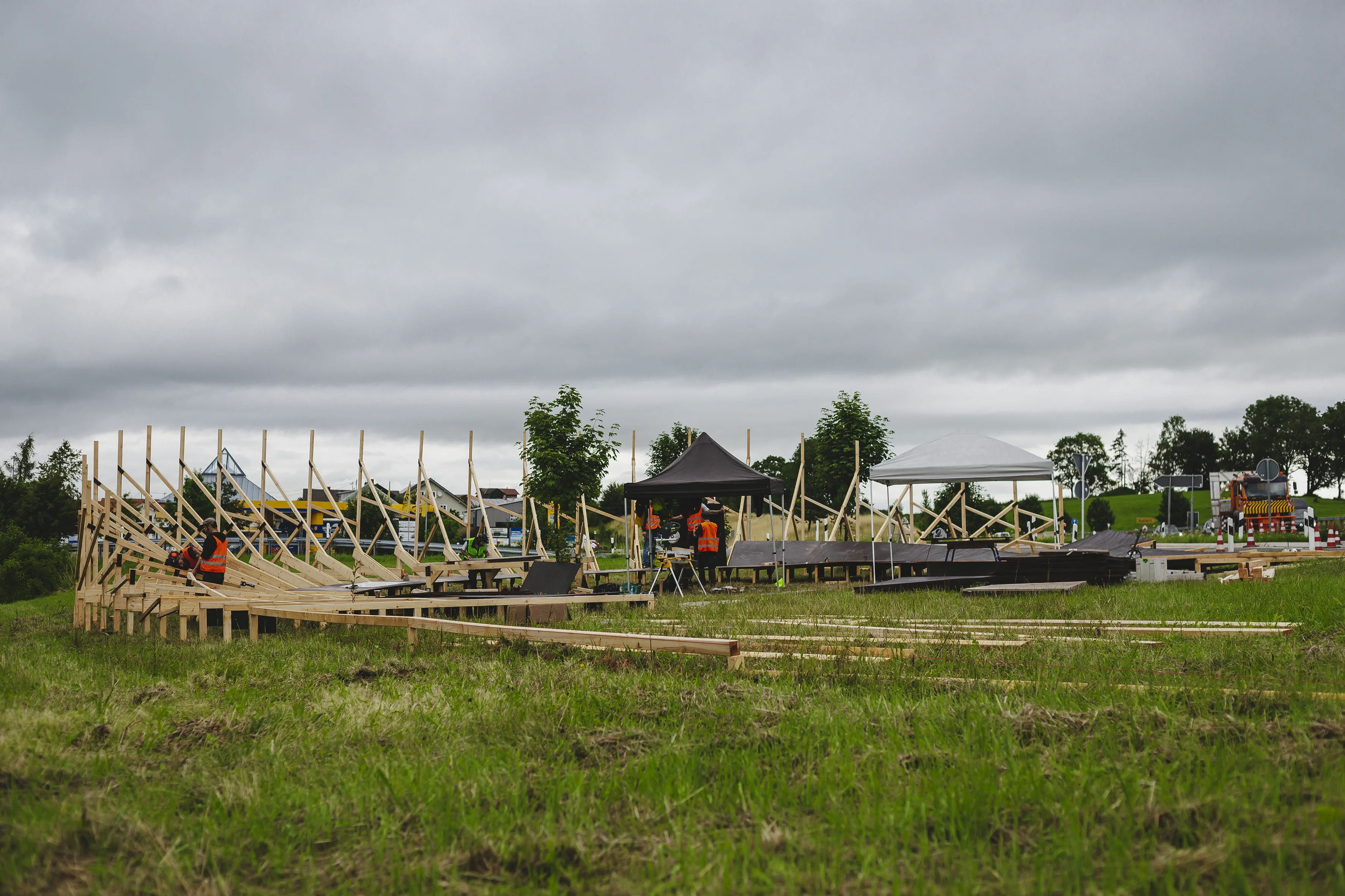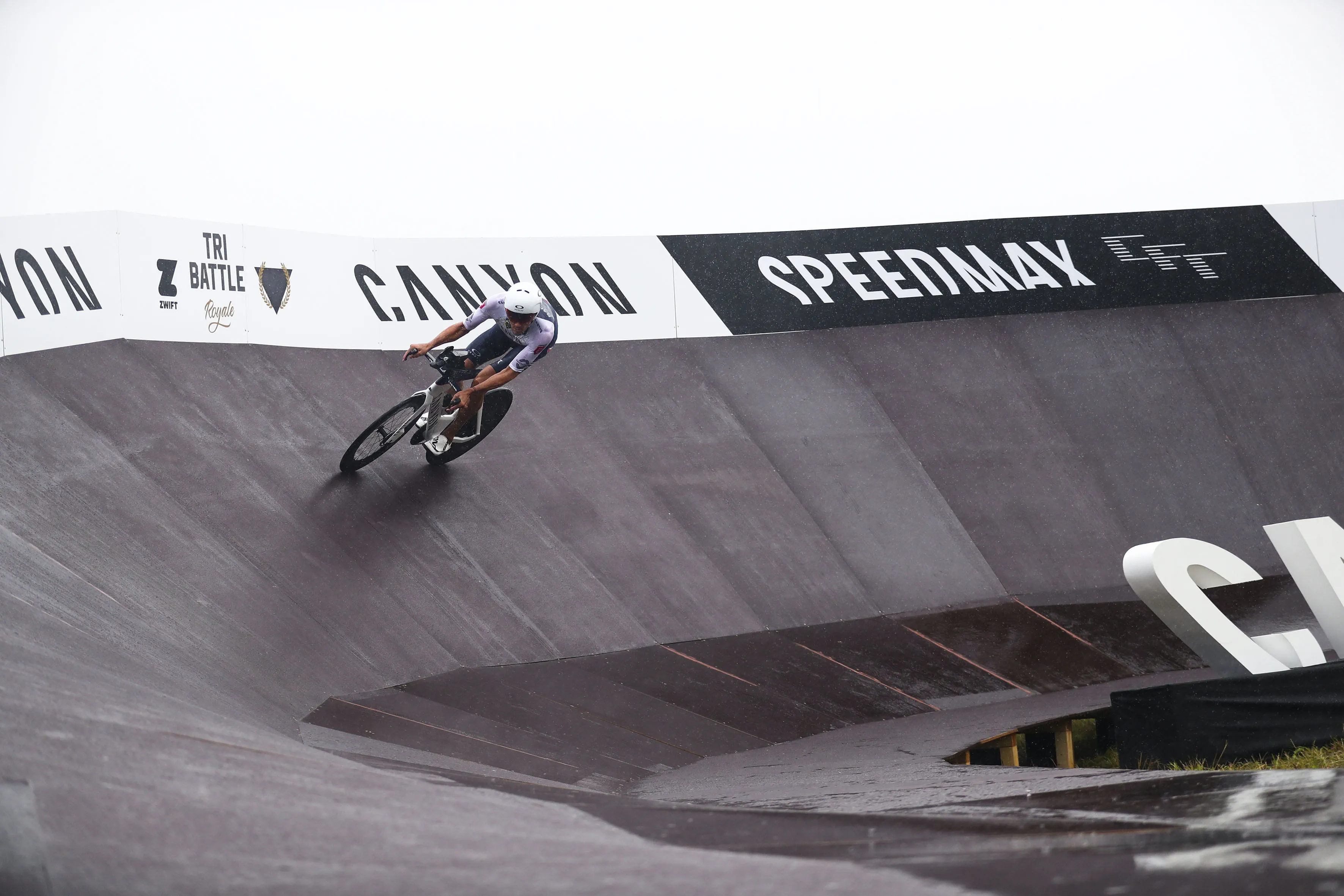 Für die neue Bestzeit mussten nicht nur die beiden Triathleten topfit sein, sondern ebenso eine geeignete Strecke gefunden werden. Dazu bot sich die mitten durch das Allgäu führende Bundesstraße 19 an – und mit mehreren Runden könnten hier die notwendigen Kilometer zusammenkommen. Gesagt, getan und zudem sollte ein geeigneter Wendepunkt dafür sorgen, dass der Weltrekordversuch nicht unnötig abgebremst wird. Die beste Lösung für das Rennen um Sekunden? Eine Rampe. Ganz aus Holz und ähnlich einer Steilwand im Bahnradsport, mit der eine schnelle Wende gelingen könnte. Prädestiniert für solche Konstruktionen ist Schneestern: Ein Anruf der Tri-Battle-Macher beim Actionsport-Spezialisten Schneestern in Durach im Allgäu sorgte für Klarheit und bei deren Chef Dirk Scheumann für leuchtende Augen. Er war sofort Feuer und Flamme für die Idee und wusste: Mit ein bisschen Holz und ein paar Schrauben ist es da nicht getan. Die Steilwand musste wegen des zu erwartenden Tempos und der damit verbundenen Belastung richtig stabil werden. Den ersten Überlegungen, Skizzen und einem Prototyp folgte die Umsetzung: 19.000 Schrauben, 10,5 Kubikmeter Holz und 96 Siebdruckplatten – so viel Material war notwendig, um Frodeno und Sanders bei ihrer neuen Radfahrbestzeit zu unterstützen. Mit 75 Meter Länge, 4,5 Meter Höhe und 300 Stunden Bauzeit war der Wendepunkt, der „Canyon Turn“, alles andere als ein Leichtgewicht und kein alltägliches Stück Handwerk. Malte Ahrens, Projektmanager bei Schneestern: „Es war massiv, es war riesig.“ Vor allem der Aufbau der Steilwandkurve an der Auffahrt zur extra gesperrten Bundesstraße sei eine Herausforderung gewesen und habe drei Tage gedauert. Während der Abbau deutlich schneller ging und am gleichen Tag nach der Tri-Battle beendet war, wurden die Bauteile für den Tag der Herausforderung vorgefertigt an ihren Bestimmungsort transportiert und dort im Baukastensystem zusammengesetzt. Was entscheidend war: Alles musste exakt sitzen. Nichts durfte wackeln, nichts durfte sich verschieben.