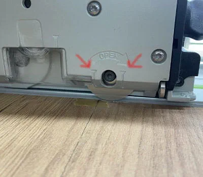 Um eine Innenfläche auszuschneiden, sind zwei Schritte nötig, damit bis in die Ecken ein perfektes Schnittergebnis erreicht wird. Das heißt, wir ritzen erst vor und im zweiten Schritt schneiden wir mit dem Haupsägeblatt nach. Dazu aktivieren wir zuerst den Vorritzer am vorderen Hebel auf "ON". Der Vorritzer ist nun aktiviert.