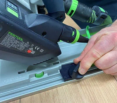 Platziere die Führungsschiene auf deiner Markierung. Nutze zwei Hebel,- oder Schraubzwingen, um die Führungsschiene an deiner Tischplatte zu fixieren. Dann setze die Vorritzer-Tauchsäge auf die Schiene und stelle die Führungsbacken spielfrei ein. Stelle den Vorritzer mittig zum Hauptsägeblatt ein, wie auf der Bedienungsanleitung der Säge beschrieben.