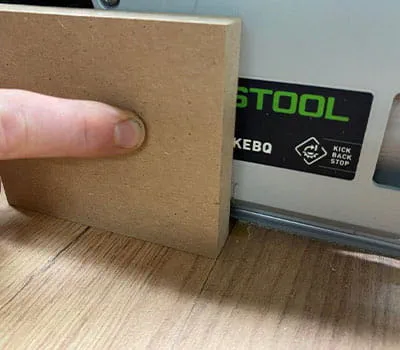 Hier gilt es, immer die zwei gegenüberliegenden Seiten zu bekanten und dann beidseitig zu fräsen, damit der Kantenanleimer nirgends hängen bleiben kann. Je nach Kantendicke müsste die Klappe vorher etwas nachgeschnitten werden. Kleiner Tipp: Die Vorderkante der Klappe kann leicht hinterschnitten werden, damit sie einfacher auf und zu geht. (Schritt entfällt bei Multiplex)