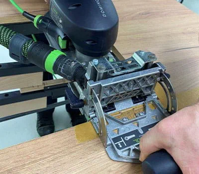 In unserem Fall passt der 12er Fräser für die Dübelfräse perfekt. Alternativ kann man hierfür natürlich auch eine Oberfräse nutzen, um die Löcher für die Scharniere passgenau einzufräsen.