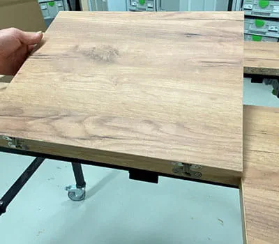 Im vorliegendem Anwendungsbeispiel erstellen wir gemeinsam eine eingelassene Revisionsklappe in einer furnierten Tischplatte, um einen Laptop direkt nach der Arbeit sauber zu verstauen und den Tisch für andere Zwecke nutzen zu können. Das Fach kann auch für andere Inlays genutzt werden. Da der Ausschnitt als Klappendeckel wieder eingebaut wird und wir nichts an der Maserung verändern möchten, muss der Schnitt rechts und links vom Sägeblatt absolut ausrissfrei sein. Die Tauchsäge mit Vorritzer hilft uns dabei.
