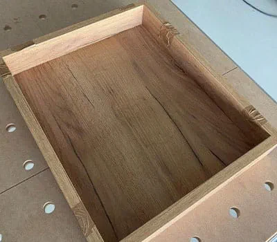 Wir drehen die Tischplatte (Unterseite nach oben) und vermitteln den Kasten zu unserer Öffnung. Nun verbinde die Teile durch Kleben oder Verdübeln und verspanne diese, bis der Kleber getrocknet ist.