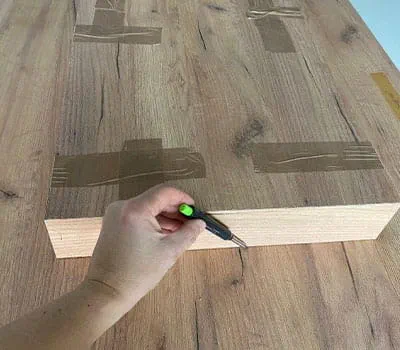 In unserem Fall arbeiten wir mit einer furnierten Tischplatte. Diese gilt es erhöht am Arbeitstisch zu fixieren, damit wir diesen nicht einschneiden (siehe Bild)