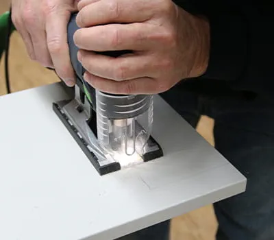 Im nächsten Schritt wird mit der Stichsäge am Anriss entlang geschnitten. Durch das Stroboskoplicht der Stichsäge ist der Anriss immer sehr gut sichtbar. Es ist darauf zu achten, dass das Werkstück immer sicher befestigt ist.