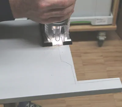 Um später die Kontur der Wand auf die Platte direkt übertragen zu können, ist es erforderlich, die nötigen Ausschnitte zuerst grob auszusägen. Dafür sollte der gewünschte Ausschitt mit ca. einem Zentimeter Übermaß auf die Passleiste angezeichnet werden.