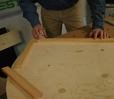 Zeichnen Sie die Breite der Abschluss‑leisten auf den Dachträgern an und schneiden die Ecken mit der Tischkreis‑säge ab. Die Verbindungslöcher für die Schrauben zwischen den Abschlussleisten und Rippen anzeichnen und die Löcher (D = 4 mm) bohren. Die Träger und die Abschlussleisten miteinander verschrauben. Die Dachträger und die Dachaußenverkleidung werden miteinander verklebt.