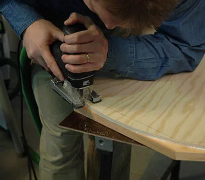 Spannen Sie die beiden Giebel zusammen und schleifen Sie den oberen Boden mit grobem Schleifpapier. Wenn Sie eine Oberfräse mit Kopierring besitzen, können Sie die Rundungen der Giebelwände auch fräsen. Zeichnen Sie die Positionen der Unterkonstruktion (Pos. 10, 11) auf den Giebelseiten an.