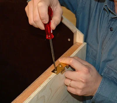 Zeichnen Sie die Position der Kulissenscharniere auf der Innenverkleidung (Pos. 17) des Daches an und schneiden Sie die Aussparungen, die die Material‑dicke der Scharniere ausgleichen, mit der Stichsäge aus. Schrauben Sie jetzt die Innenverkleidung am Dach fest. Die Verbindungslöcher (D = 4,5 mm) zwischen den einzelnen Wänden bohren und die Hütte zusammen schrauben.