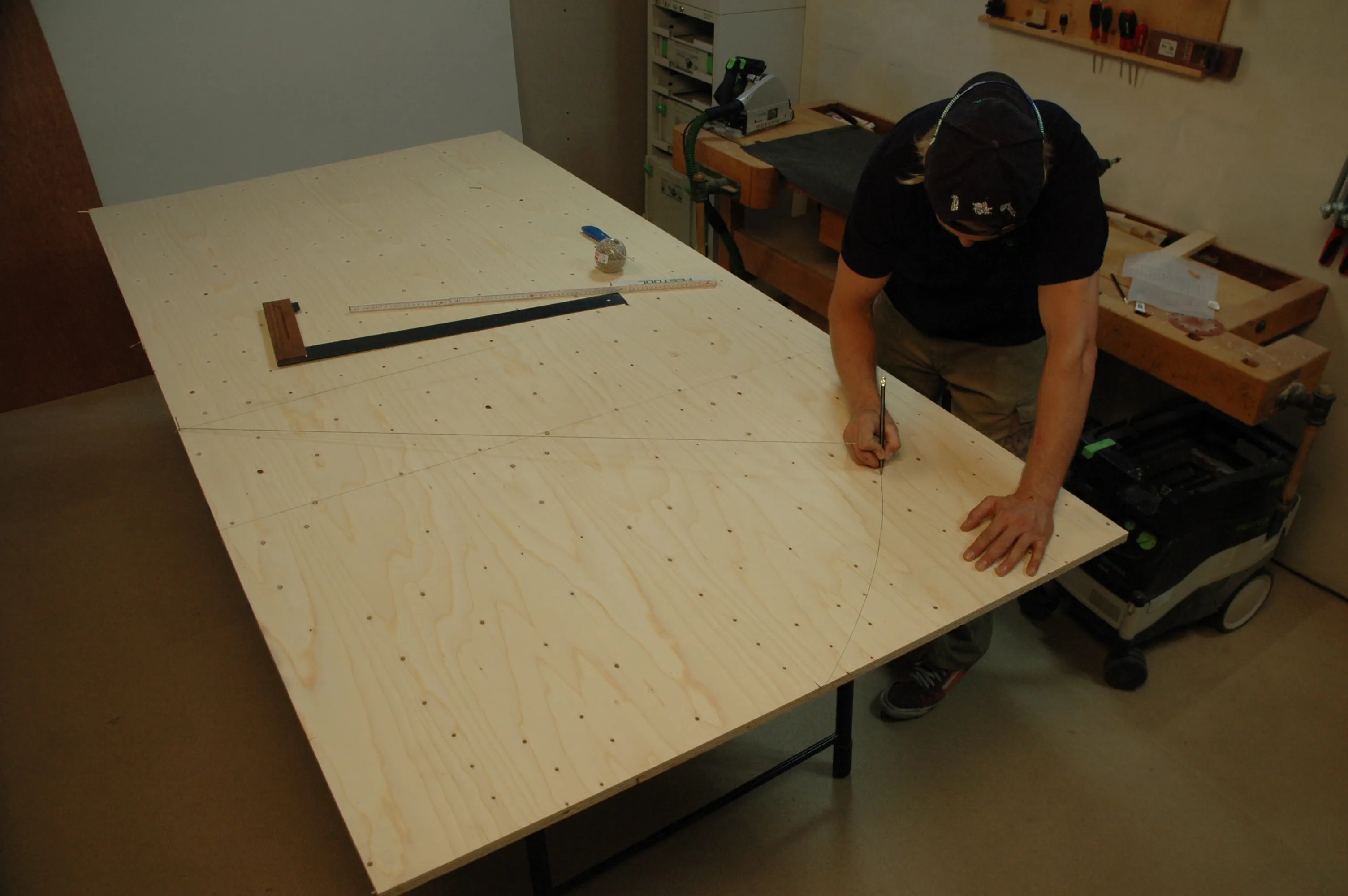 Zeichnen Sie sich mit Hilfe einer Schnur, die als Zirkel dient, im angegebenen Radius die beiden Außenrundungen an einer Deckplatte (Pos. 1) an. Zunächst wird die Breite der Deckplatte auf der Platte angezeichnet. Markieren Sie dann auf der Vorderseite den Mittelpunkt und zeichnen Sie den Ausschnitt für Kopf und Schweif ein.