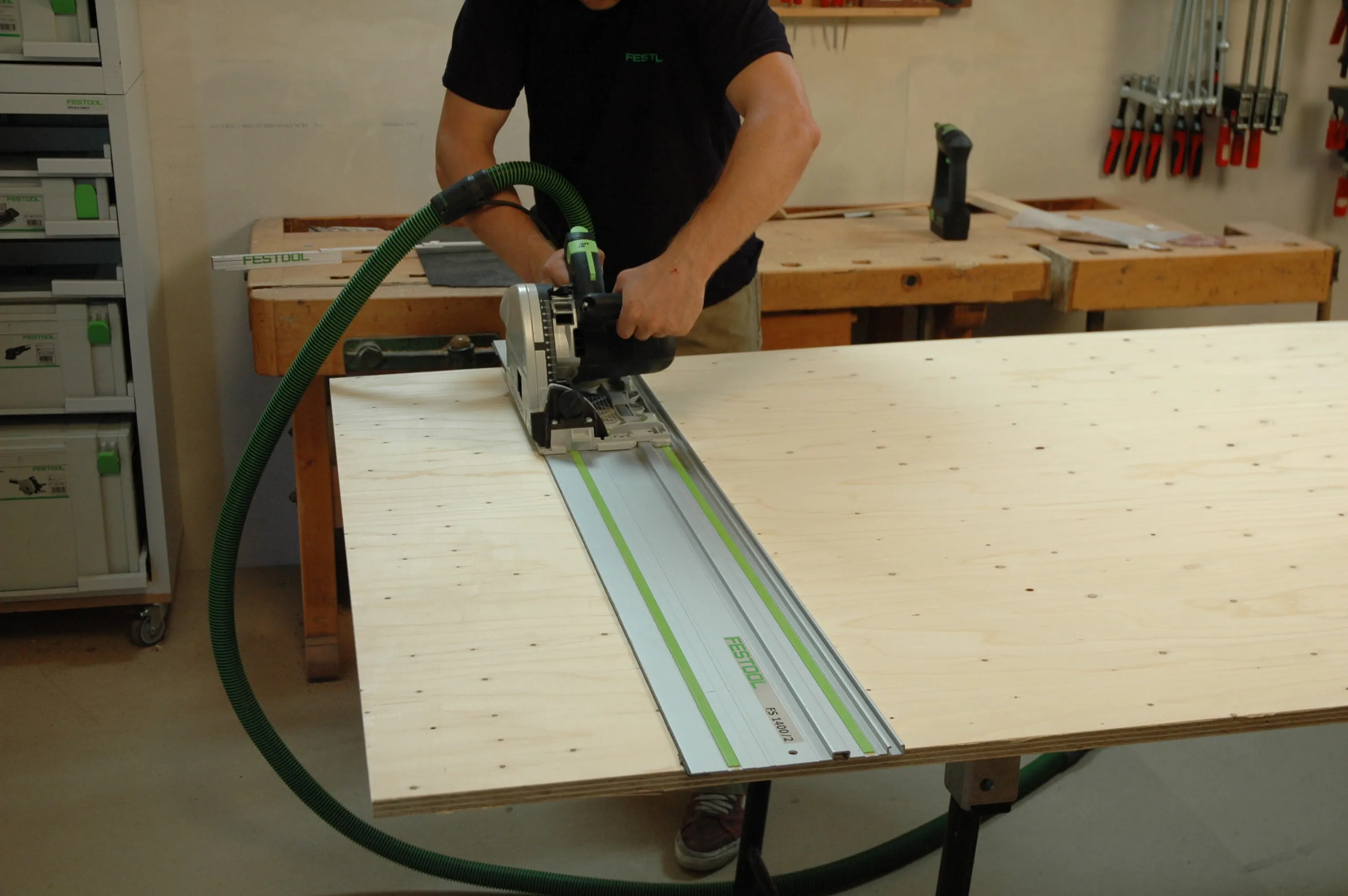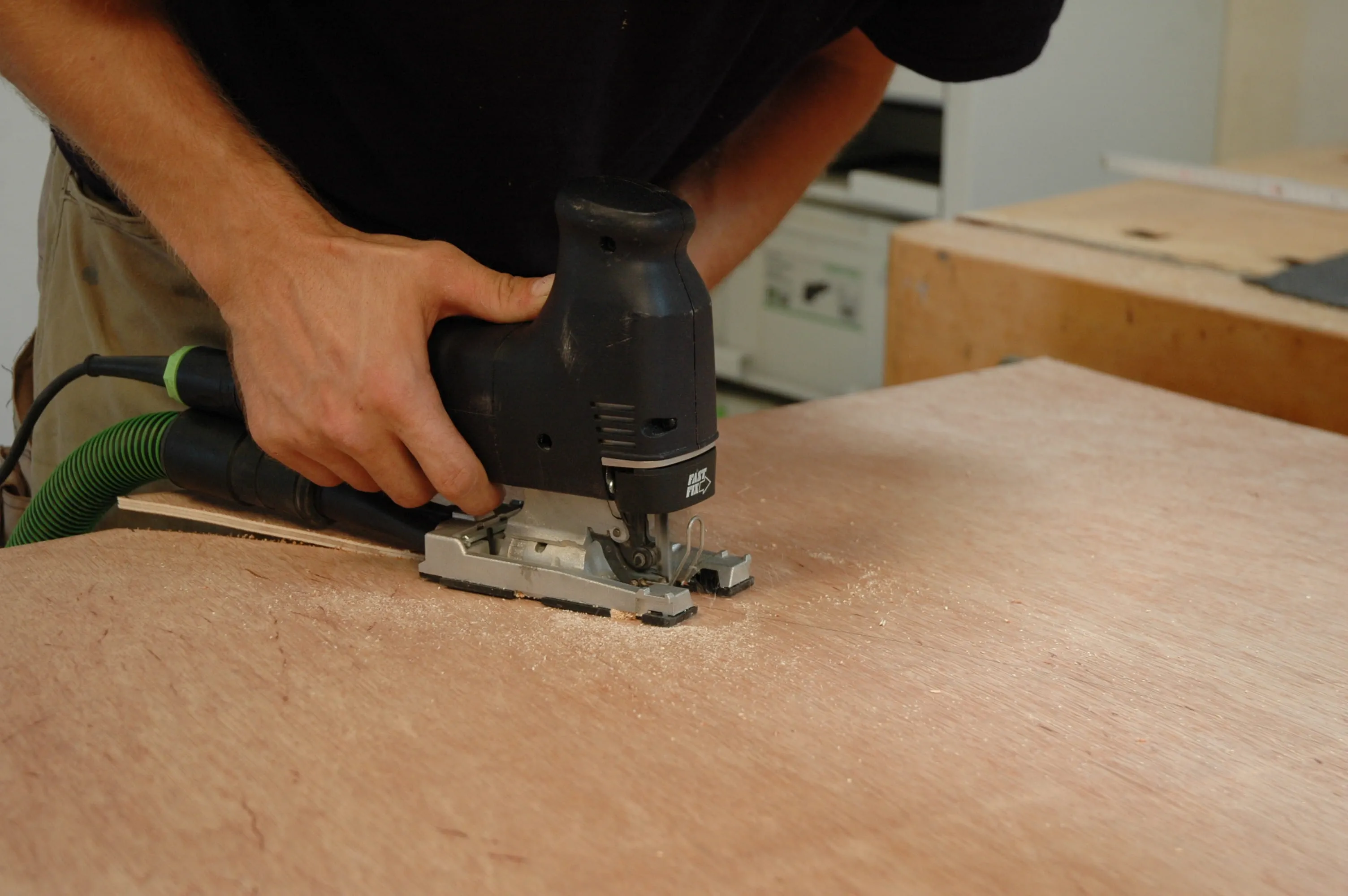 Schneiden Sie auch diese drei Teile mit der Stichsäge aus und entgraten Sie die Schnittkanten mit einem Handschleifklotz. Die geraden Platten werden mit einer Handkreissäge und einer Führungsschiene zugeschnitten. Alternativ können Sie gerade Einzelteile auch im Baumarkt zuschneiden lassen.