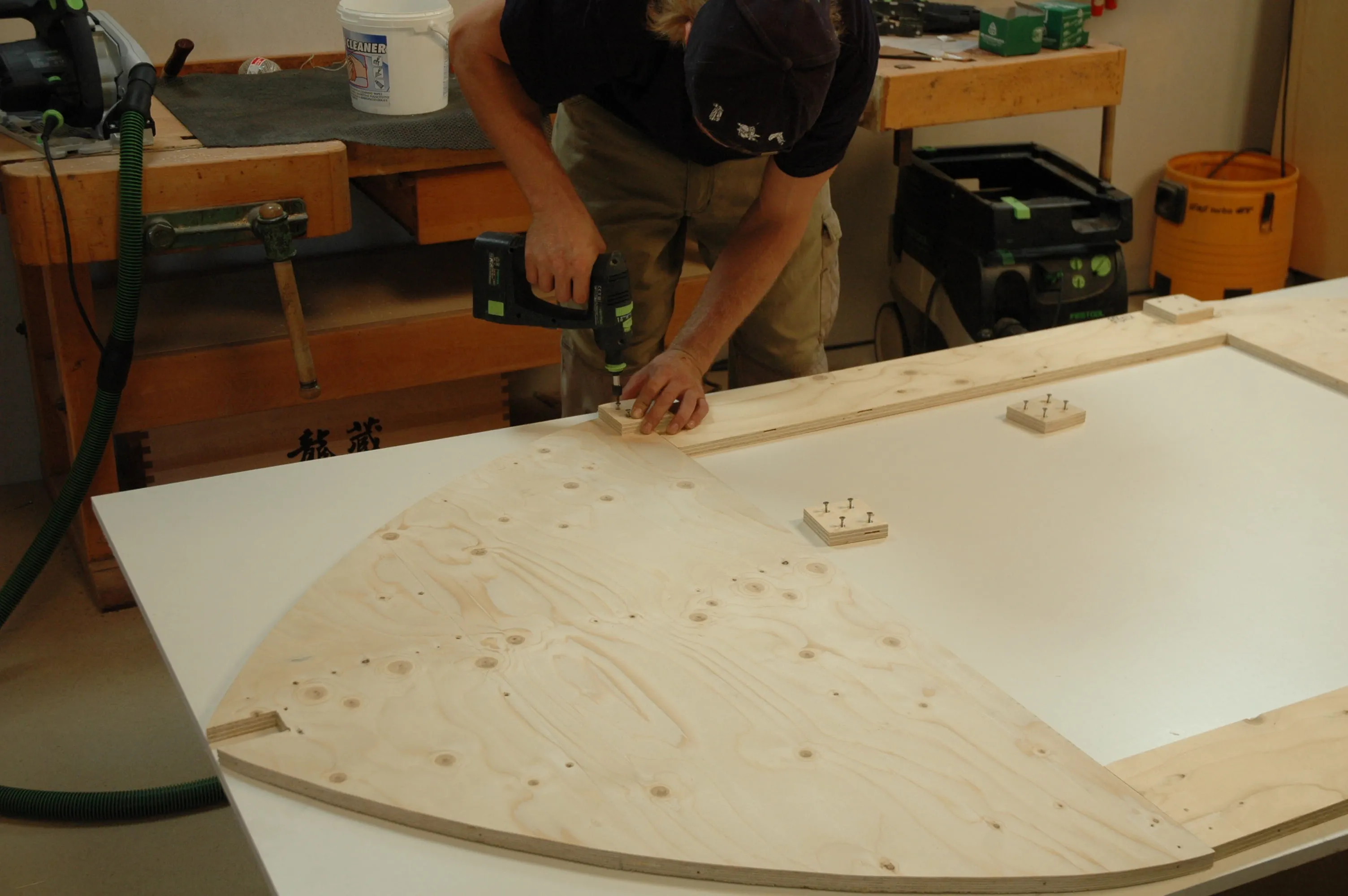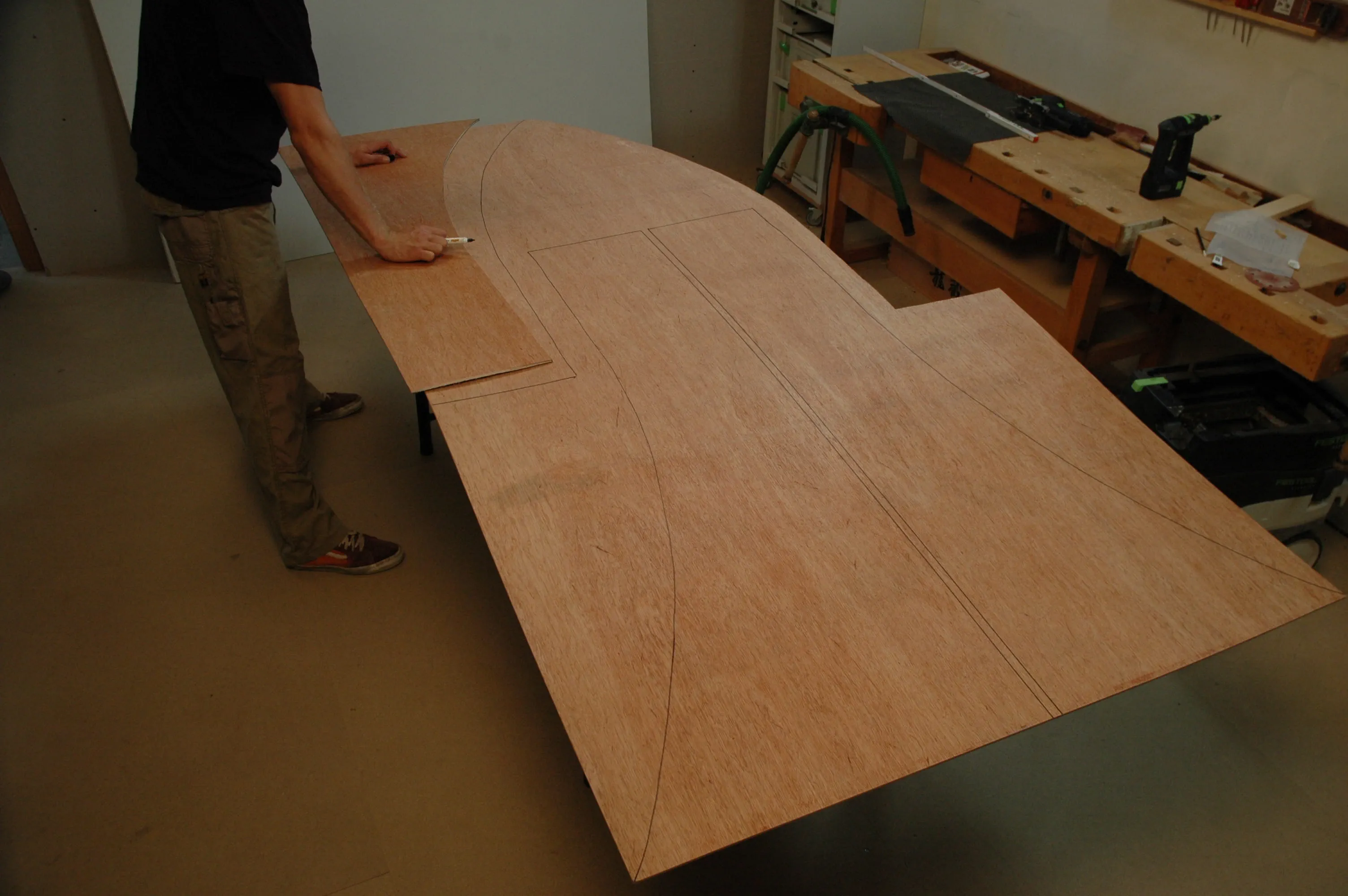Halten Sie die erste Sperrholzplatte ans Boot und zeichnen Sie die Positionen der Schrauben an. Die ersten beiden Platten festschrauben. Wenn Sie die anderen beiden Platten festschrauben, werden Sie merken, dass es in der Mitte zu einer Überlappung kommt. Zeichnen Sie diesen Überstand auf der befestigten Platte an und lösen Sie diese soweit, dass ein Stück vom Boot absteht. Schneiden Sie jetzt mit der Stichsäge oder hobeln Sie mit dem Handhobel diese Überlänge ab.