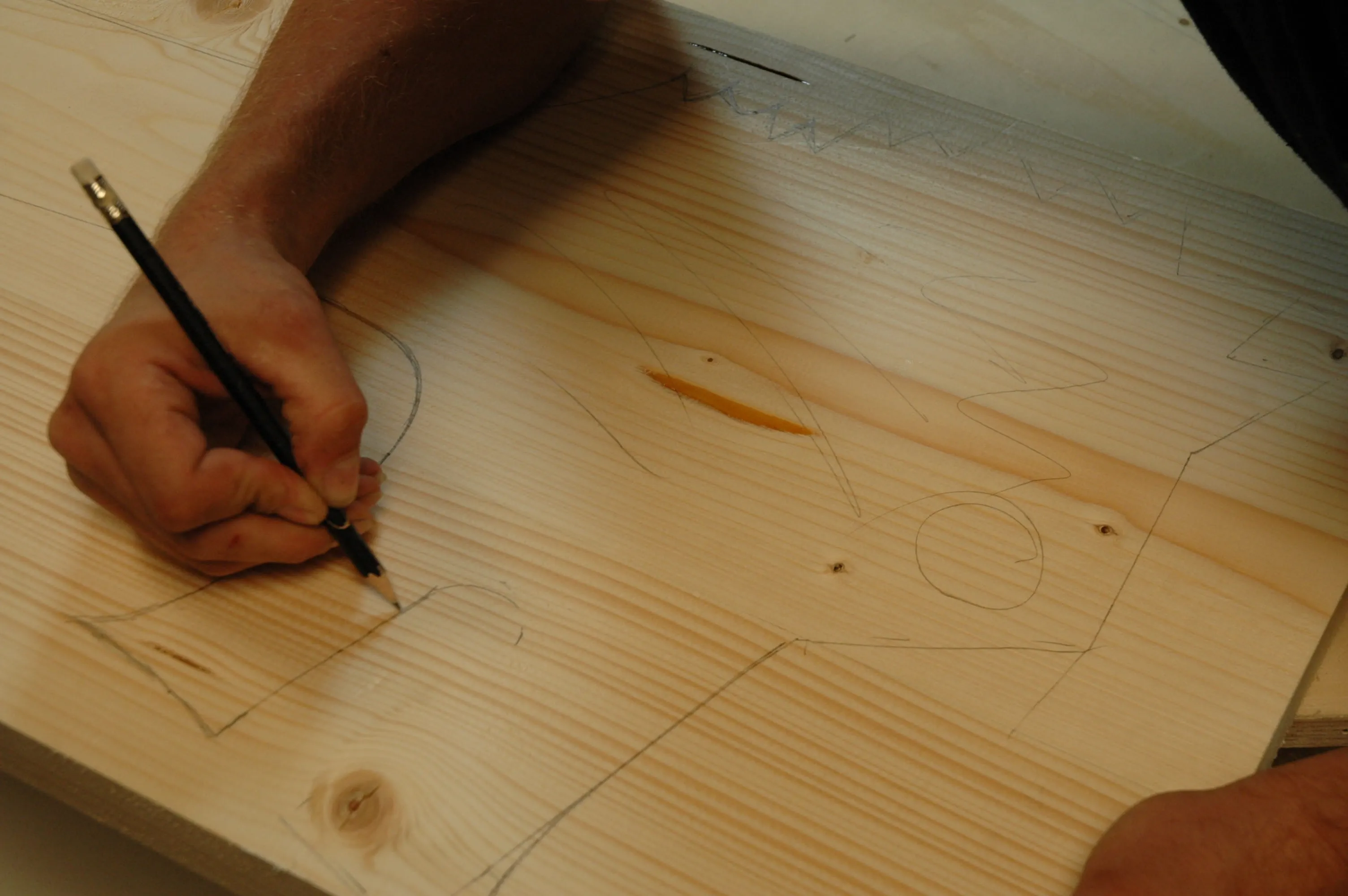 Um den Drachenkopf größer gestalten zu können, wird ein Rest der Baubohle als Schnauze angeleimt. Zeichnen Sie die Form von Kopf und Schwanz mit einem Bleistift auf. Schneiden Sie die Konturen dann mit der Stichsäge aus. Benutzen Sie ein Kurvensägeblatt und sägen Sie langsam.