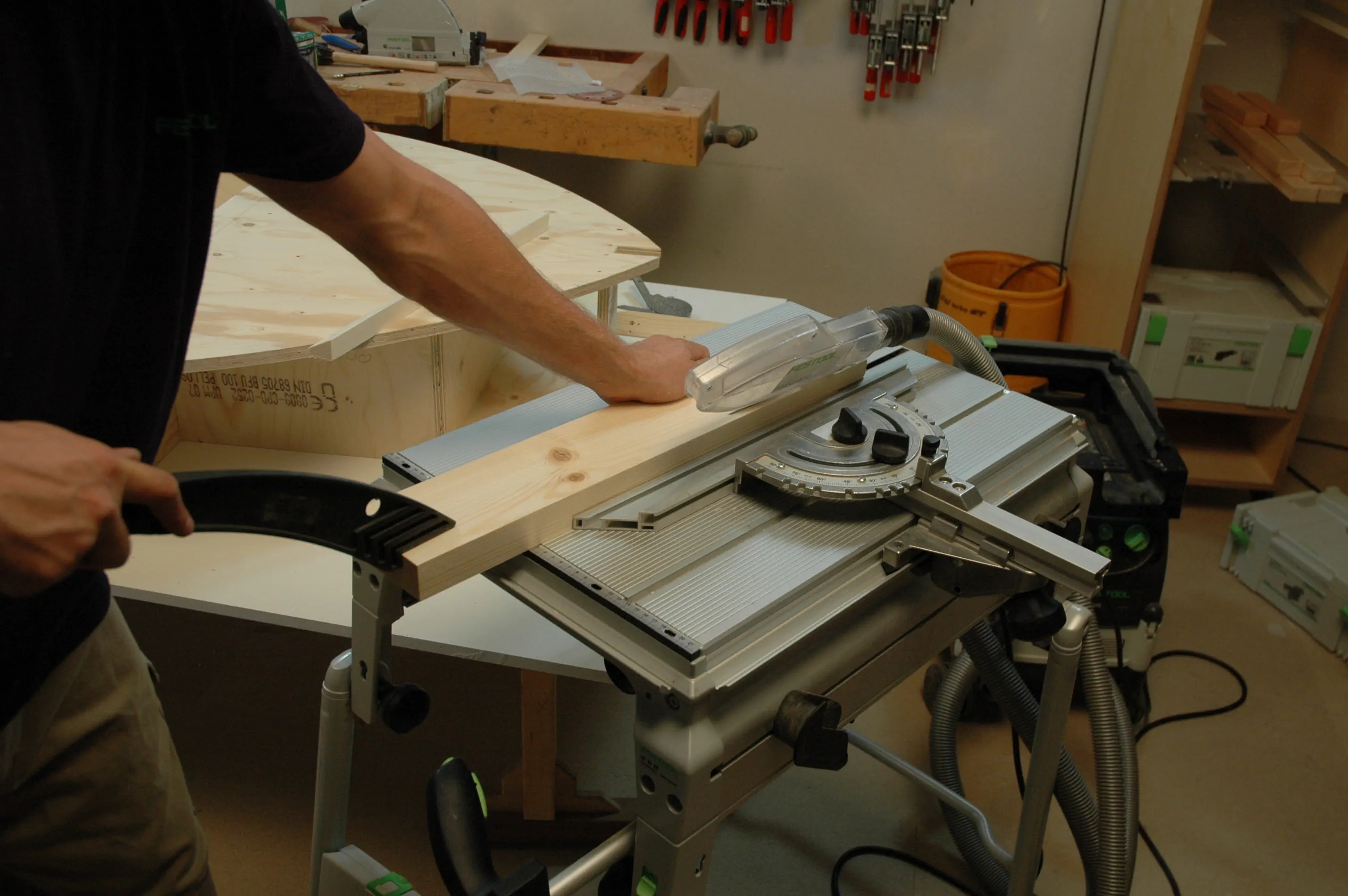 Die vier Befestigungsleisten (Pos. 11) werden mit einer Tischkreissäge schräg (30 Grad) geschnitten. Schneiden Sie diese Leisten auf das angegebene Maß ab.