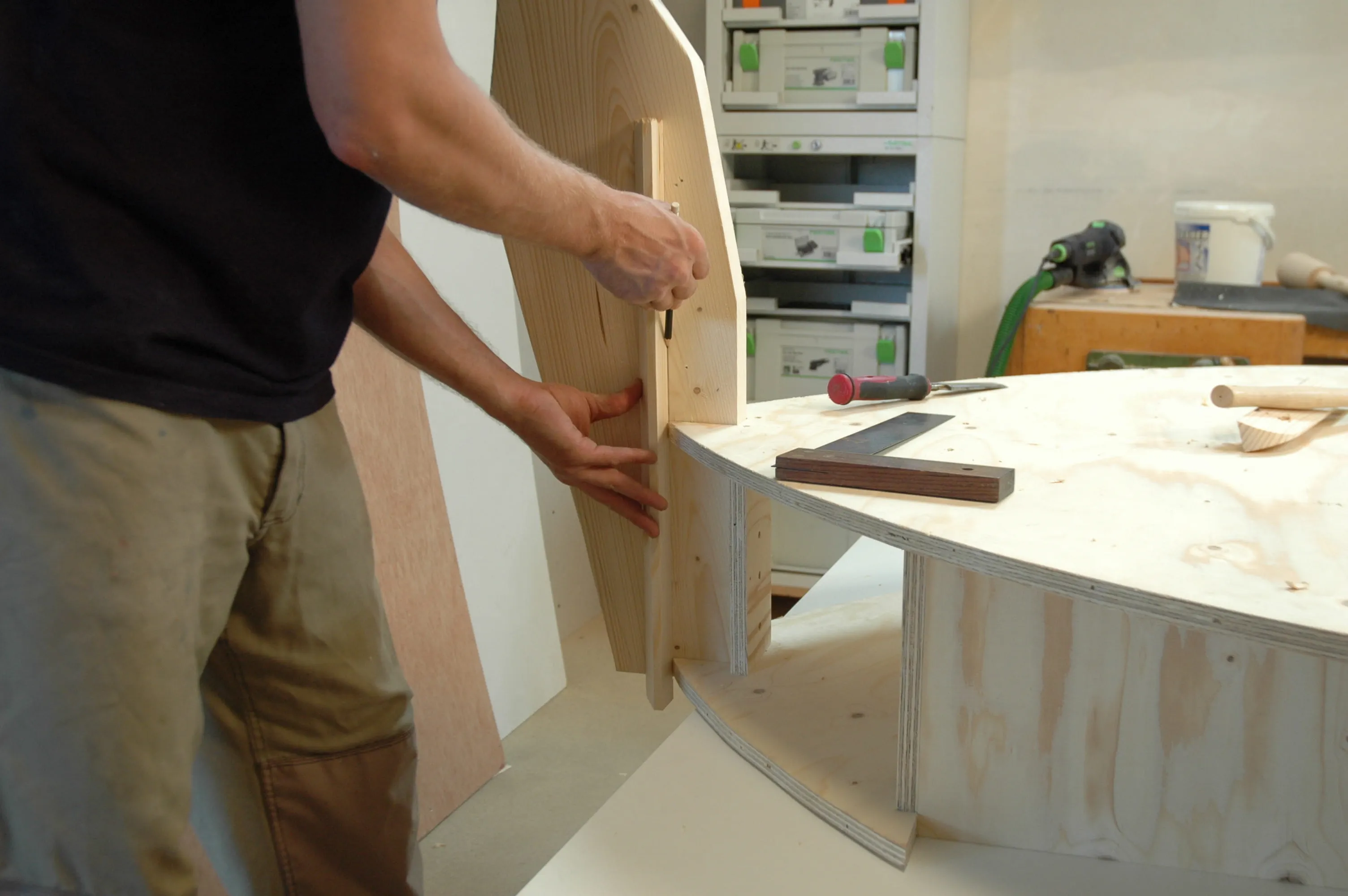 Schlagen Sie in den ersten Mittelpunkt einen Nagel ein und befestigen Sie daran die Schnur. In eine Schlaufe auf der anderen Seite der Schnur wird ein Bleistift eingesteckt. Zeichnen Sie zunächst beide Rundungen einer Deckplatte an, schneiden Sie diese aus und übertragen Sie dann die Kontur auf die andere Deckplatte und auf die Bodenplatten (Pos. 6).