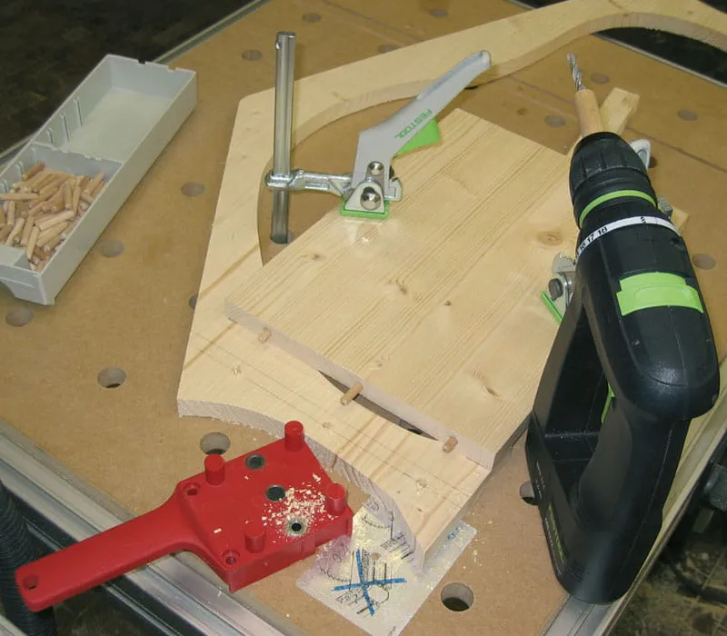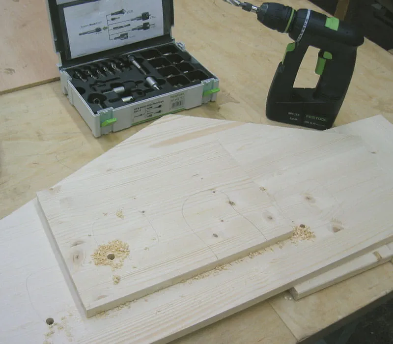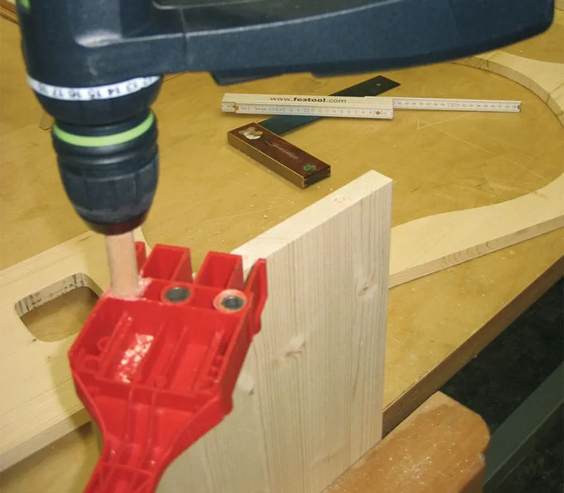 Bohren der Dübellöcher (ø 6 mm) im Querholz der Seitenwände mit Hilfe einer Dübelschablone.