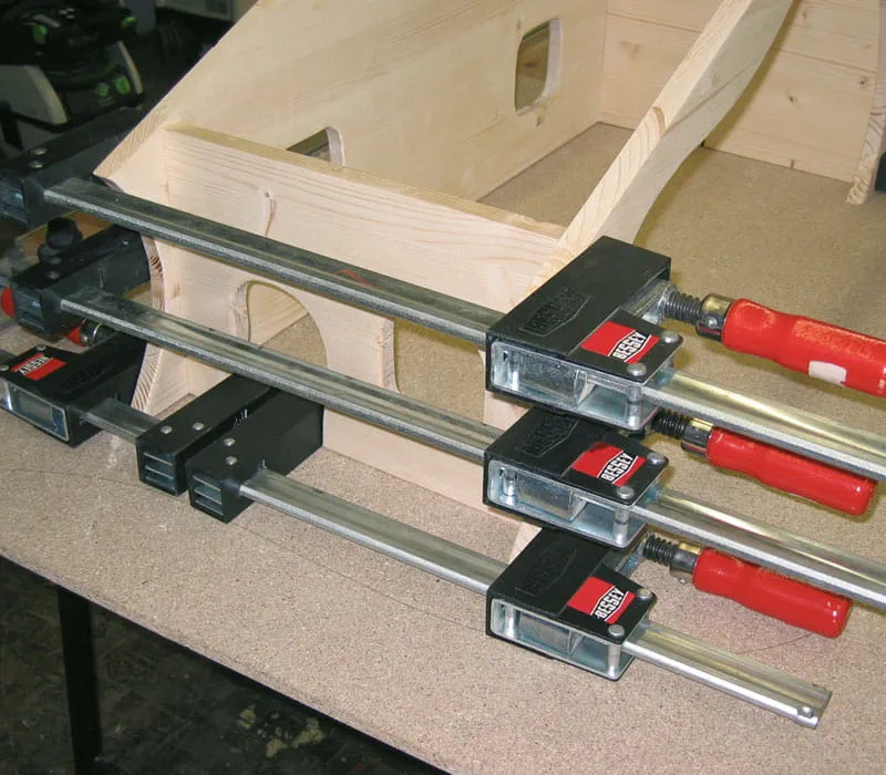 Mit Zwingen und Zulagen oder mit Spezialzwingen (z. B. Korpuszwingen) verspannen. An der Türe zwei Zwingen ansetzen (siehe Bild)